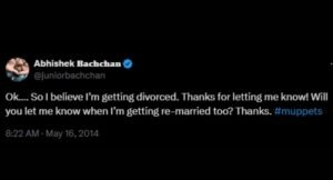 इन अफवाहों पर अभिषेक बच्चन ने चुटकी ली, साल 2014 में अभिषेक और ऐश्वर्या के तलाक लेने की चर्चाएं थी। उस वक्त अभिषेक बच्चन ने चुप्पी साधने की बजाय इससे इनकार कर दिया था और अपने फेन्स से भी कहा था कि वे झूठे दावों पर ध्यान न दें अभिषेक ने एक्स पर लिखा, ‘चलो मान लेते हैं कि में तलाक ले रहा हूं। मुझे बताने के लिए धन्यवाद। जब में दोबारा शादी करूंगा तो क्या आप मुझे बताएंगे?