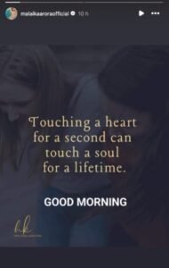 अर्जुन कपूर के खुद को सिंगल कहने के बाद, मलाइका अरोड़ा ने अर्जुन कपूर द्वारा अपने ब्रेकअप की सार्वजनिक पुष्टि के बाद दिल को छू लेने वाली एक रहस्यमयी पोस्ट शेयर की। जिसमे मलाइका ने इंस्टाग्राम पर ‘दिल और आत्मा’ पर एक कोट शेयर किया। इसमें लिखा था: “एक सेकंड के लिए दिल को छूना जीवन भर के लिए आत्मा को छू सकता है।” Read More: सलमान अकेले सब पर भारी